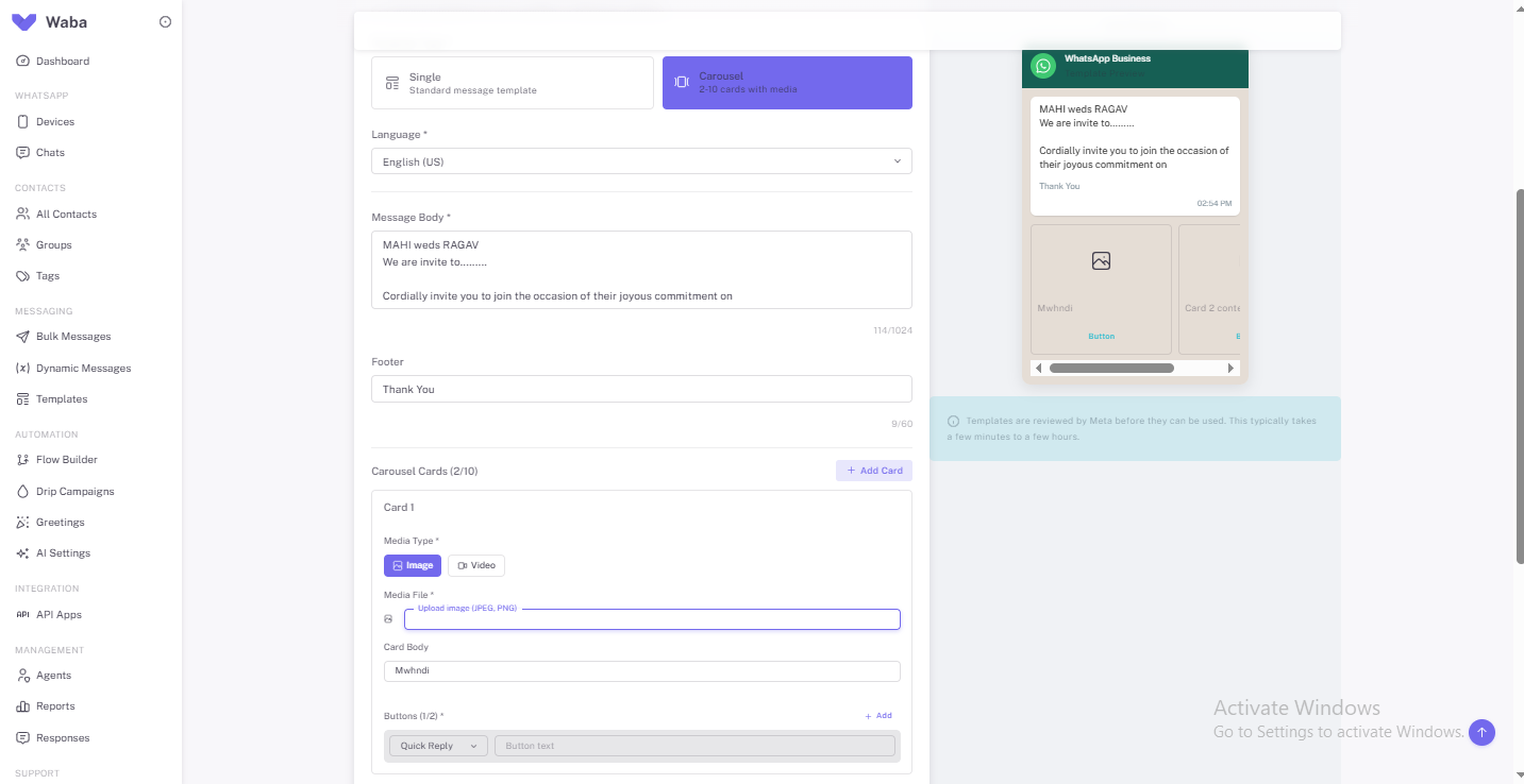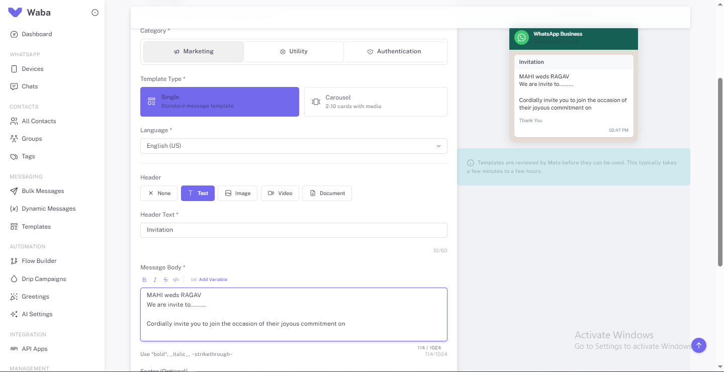 Template Messaging ensures businesses can deliver compliant WhatsApp communications for marketing and transactional use cases. Templates cover payment reminders, appointment confirmations, shipment updates, onboarding messages, reactivation campaigns, and more. With support for dynamic variables, multi-language formats, and approval management, templates guarantee policy-safe messaging with brand consistency. Templates can be reused for automation, chatbot flows, bulk campaigns, and triggered events—saving time and accelerating delivery.