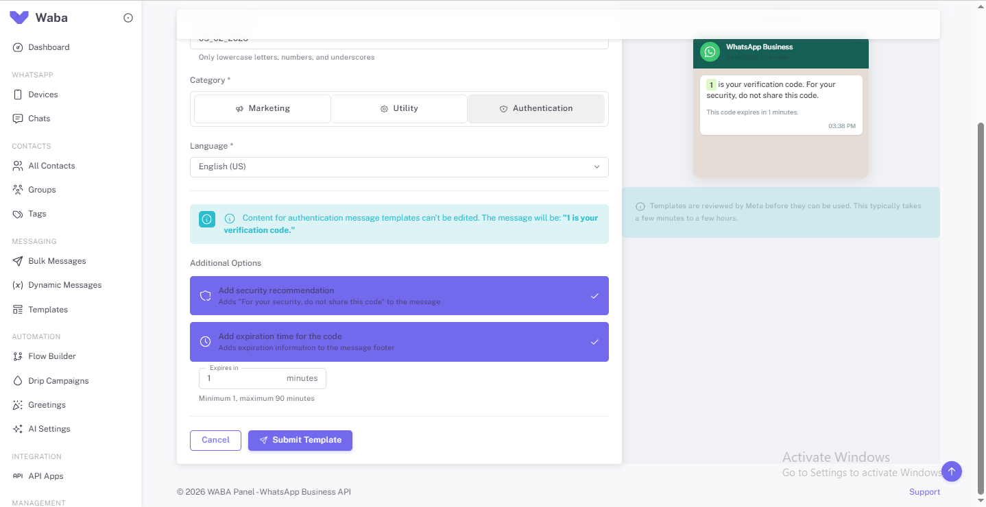 template category (Marketing / Utility / Authentication)