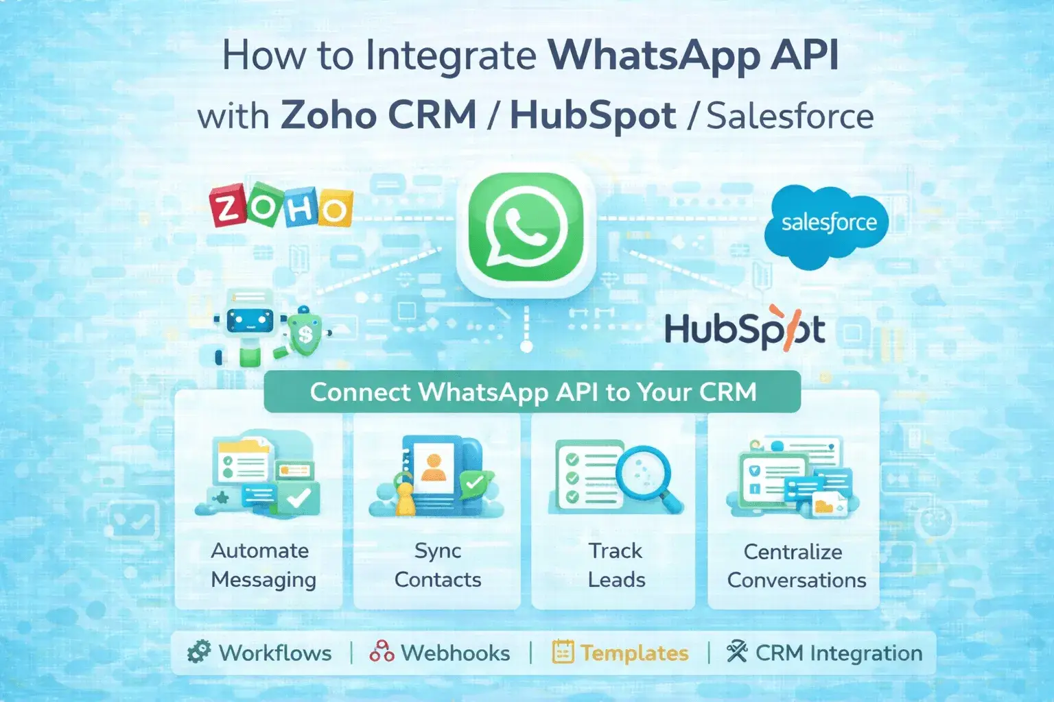 Integrating the WhatsApp Business API with your CRM helps you automate lead follow-ups, send notifications, manage conversations, and track customer interactions in one place. This guide explains how to connect WhatsApp API with Zoho CRM, HubSpot, and Salesforce in a compliant and scalable way.