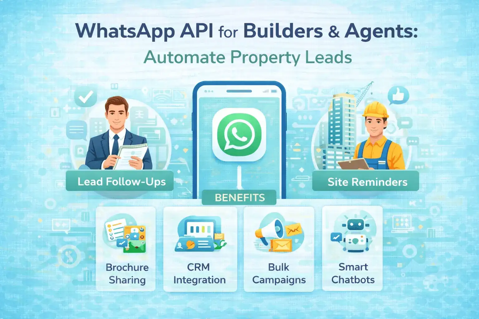 Boost property sales with WhatsApp Business API. Automate real estate lead follow-ups, site visit reminders, brochure sharing, and CRM integration for agents & builders.